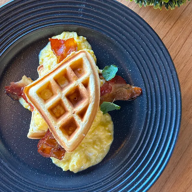 Waffle sandwich com ovos mexidos, bacon crocante e requeijão defumado, um clássico reinventado. (lactose/glúten/ovos)