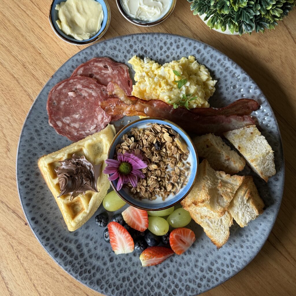 Omelete ou ovos mexidos, torradas, bacon, salame, requeijão, manteiga, iogurte com frutas e granola, waffle com Nutella, um convite à celebração. (glúten/lactose/ovos)