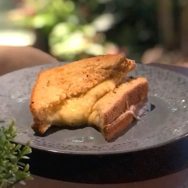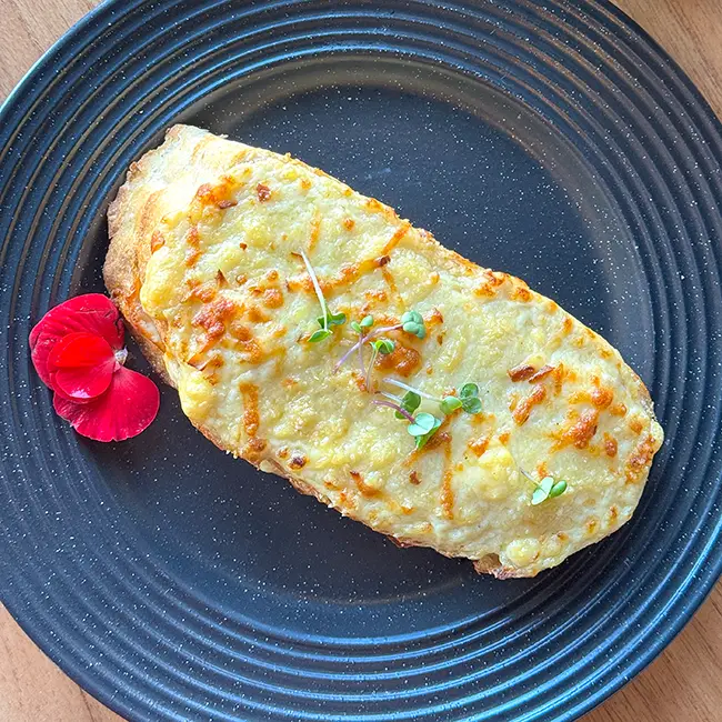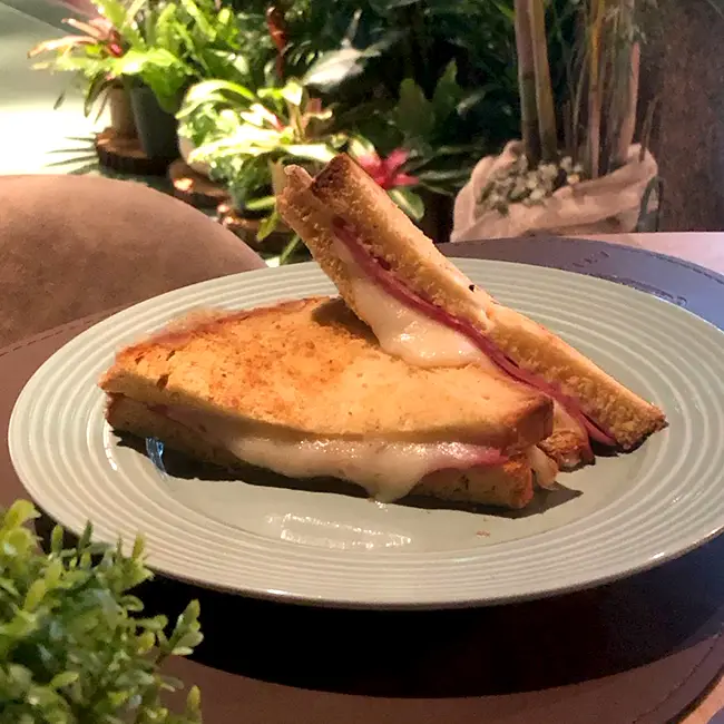 Croque-monsieur com pão sourdough, molho de mostarda com toque de limão, queijo e presunto, finalizado com molho bechamel e gratinado, uma viagem aos sabores da França. (lactose/opção sem glúten/carne de porco
