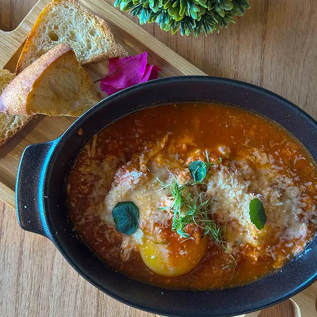 Ovos no purgatório, cozidos em molho de tomate caseiro, finalizados com parmesão e servidos com torradas, uma experiência intensa e saborosa. (ovos)