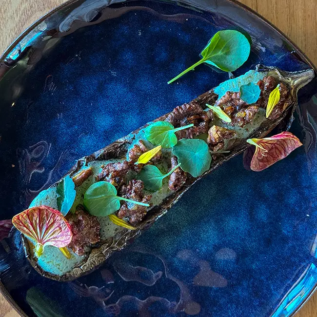 Berinjela grelhada com creme de gorgonzola, nozes caramelizadas e brotos verdes, uma explosão de cores e sabores. (lactose/nozes)