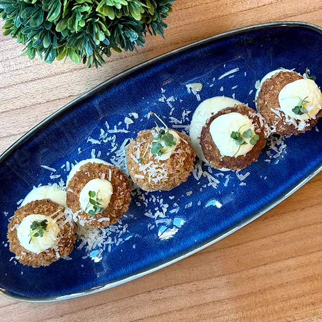 Croquetes com molho bechamel e presunto de Parma tostado, acompanhados de maionese de parmesão, uma tentação irresistível. (glúten/lactose/ovos/carne de porco)