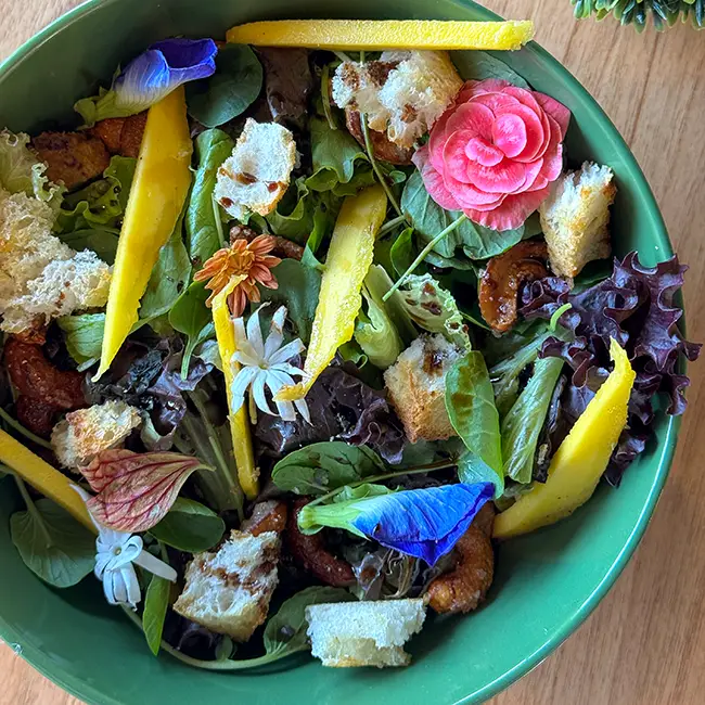 Salada com mix de folhas verdes, manga, morangos, castanha de caju caramelizada, croutons e molho balsâmico agridoce, uma explosão de frescor e vitalidade. (glúten/castanhas)