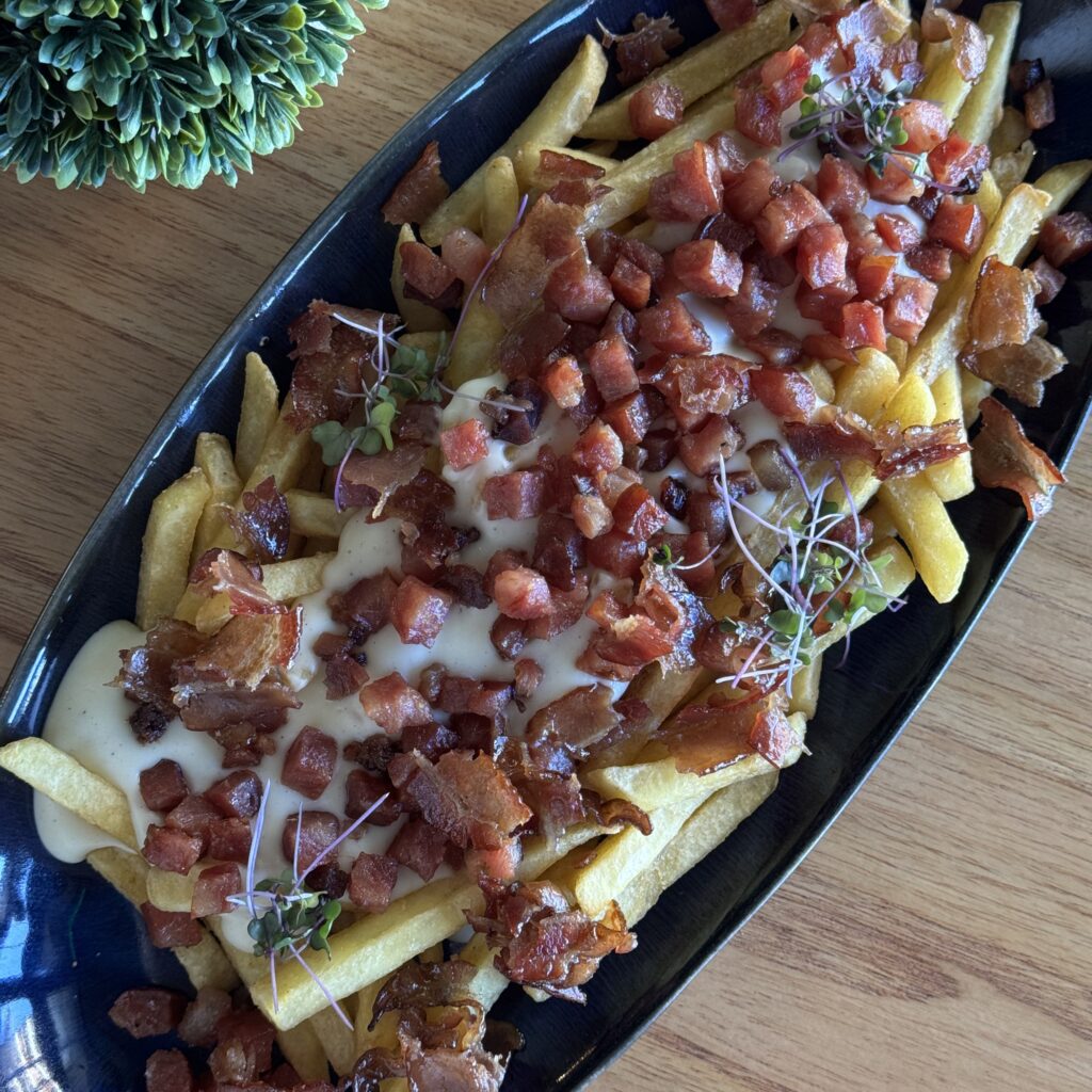 Batata com Bacon Crocante e Molho de Queijo.