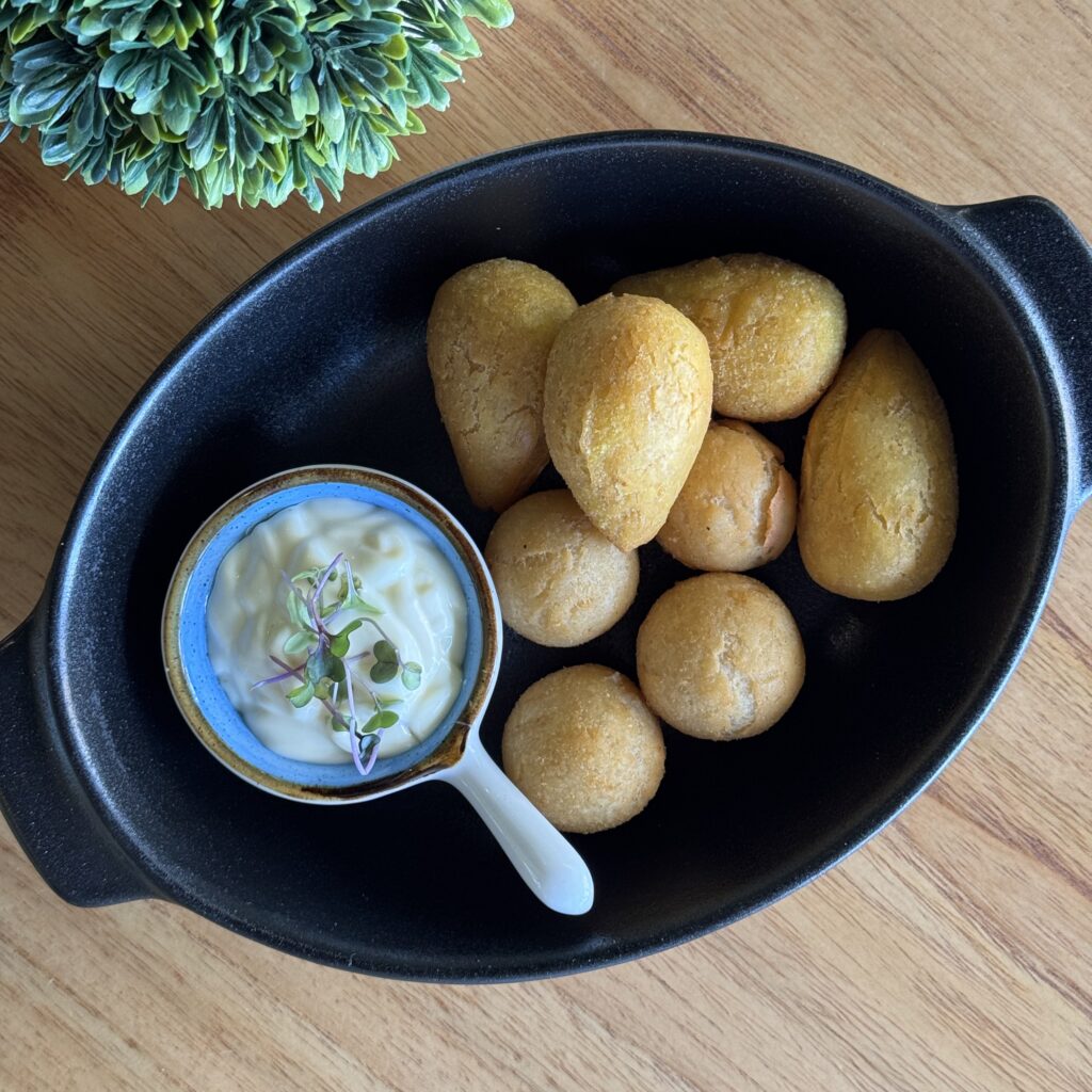 Pão de queijo mineiraço, requeijão defumado especial da casa. (glúten, lactose)