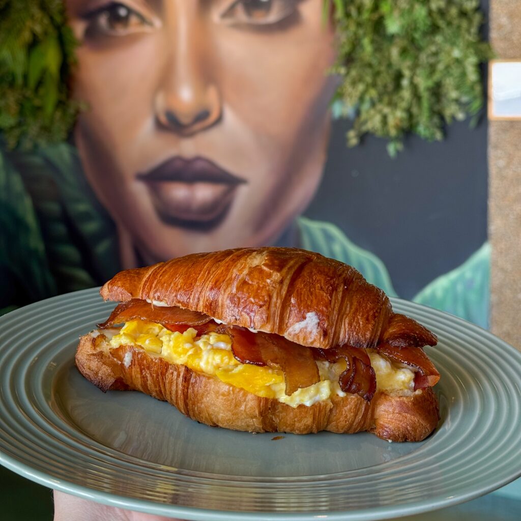 Croissant com ovo mexido na manteiga e bacon caramelizado da casa (glúten, lactose, ovos, carne de porco).